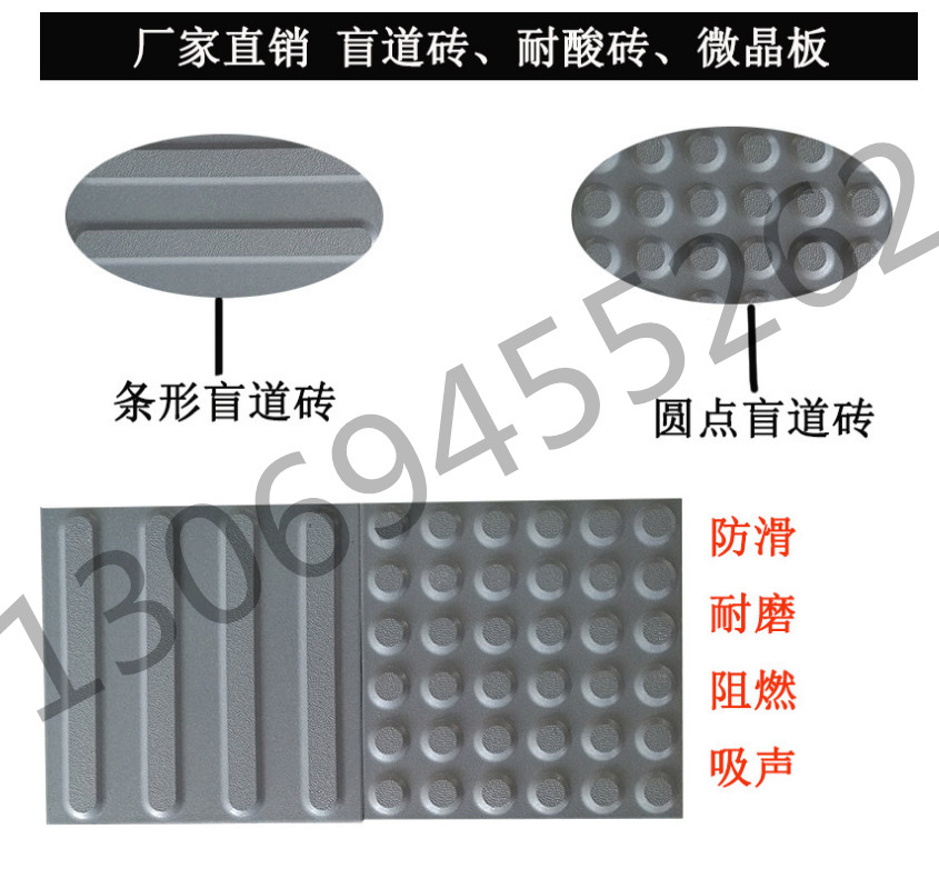 盲道磚是為盲人安全提供的行路方便道路設施。盲道磚由三類磚鋪設,一類是條形方向引路磚,引導盲人放心前行,稱為行進盲道磚,或盲道方向引路磚;一類是帶有圓點的提示磚,提示盲人前面有障礙,該轉彎了,稱為提示盲道磚,或盲道方位引路磚;還有一類是盲道危險警告引路磚,圓點較大的,是警視不要超越,前面危險。