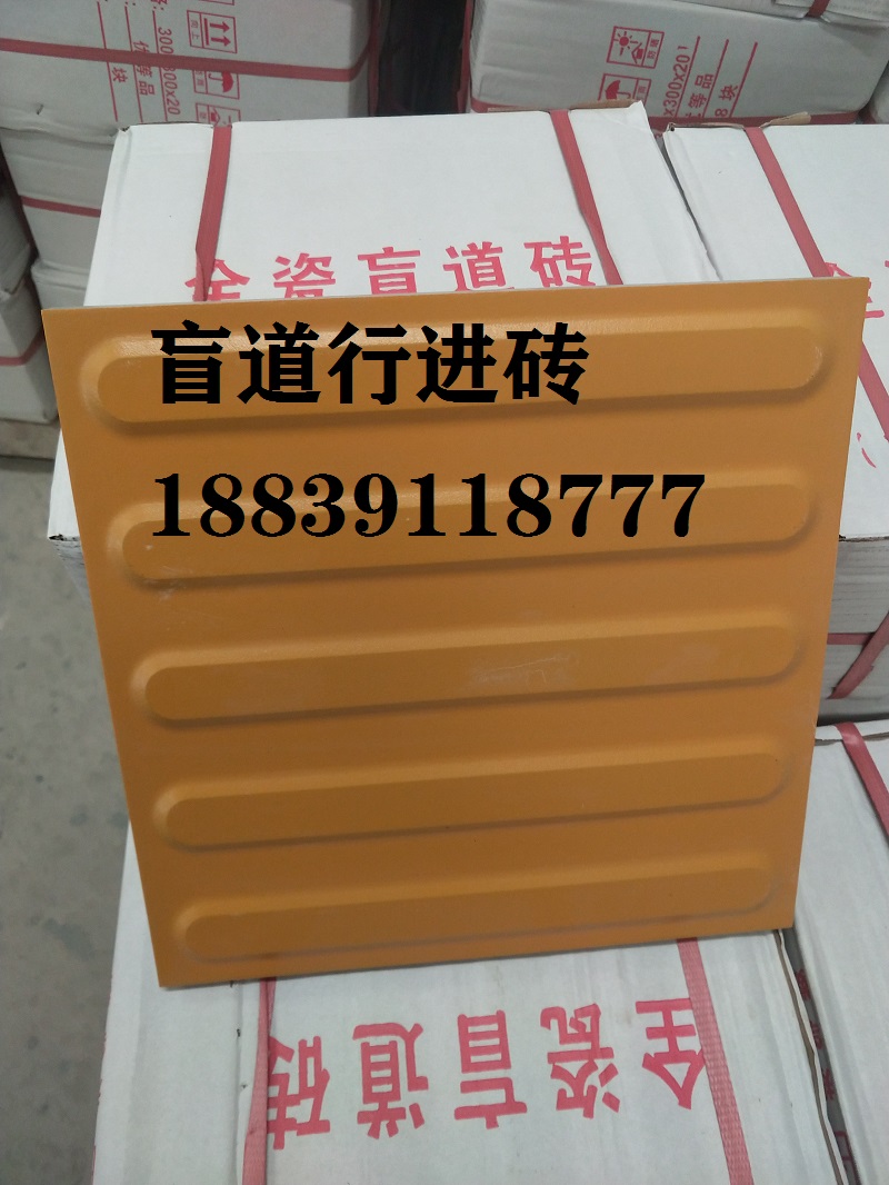 我公司生產銷售的全瓷盲道磚有圓點止步盲道磚、條形導向盲道磚、大圓點禁止盲道磚三種。規格有300×300mm、250×250mm、300×250mm、400×400mm,厚度均為20mm、25mm。歡迎廣大客戶咨詢選購。
